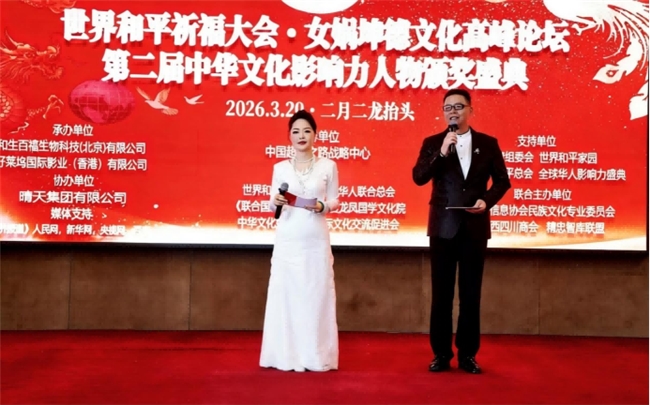 2026年3月20日(农历丙午年二月初二),正值中华传统佳节“龙抬头”之际,二月二龙抬头世界和平祈福大会、暨女娲坤德文化高峰论坛、暨第二届中华文化影响力人物颁奖盛典,在北京四川会馆10号会议厅隆重举行。本次大会由中国超越之路战略中心指导,世界和平总会、世界华人联合总会、《联合国友好画报》、华夏龙凤国学文化院、中华文化始祖伏羲国际文化交流促进会主办,中国信息协会民族文化专业委员会、广西四川商会、精忠智库联盟联合主办,由和生百福生物科技(北京)有限公司、好莱坞国际影业(香港)有限公司承办,协办单位是晴天集团有限公司,支持单位有中国梦组委会、世界和平家园、世界大同和平总会、全球华人影响力盛典,以“龙启新程·坤德润世·文脉传承·祈福中华”为宗旨,汇聚全国各地的文化学者、行业精英、社会各界贤达,共同祈福世界和平,共话坤德文化传承,致敬时代影响力人物,《中国经济报道》、人民网、新华网、央视网、今日头条等主流媒体莅临现场报道。