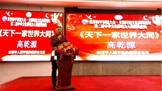 全球华人国学盛典组委会主席、华夏龙凤国学文化院院长高乾源以《天下一家 世界大同》为主题发表主旨演讲,他指出: