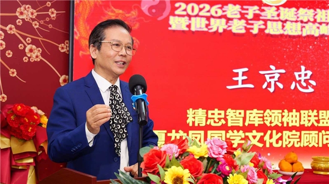 中国孔子文化奖章荣获者、精忠智库领袖联盟主席、华夏龙凤国学文化院顾问委员会主席王京忠致辞。作为资深媒体人,王京忠主席以专业新闻视角,对大会从奏唱国歌、观看宣传片、祭祖敬香到前序嘉宾发言的全流程进行高屋建瓴的系统总结与概括,并结合老子文化传播的时代使命,深入阐述中华优秀传统文化传承的重要意义,为活动注入深刻的思想内涵。