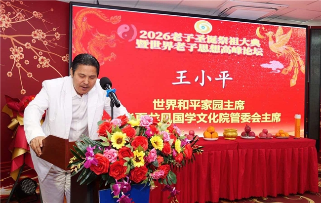 世界和平家园主席、华夏龙凤国学文化院管委会主席王小平发表主旨演讲,立足和平发展理念,探讨老子“和为贵”思想对构建人类命运共同体的深远启示。