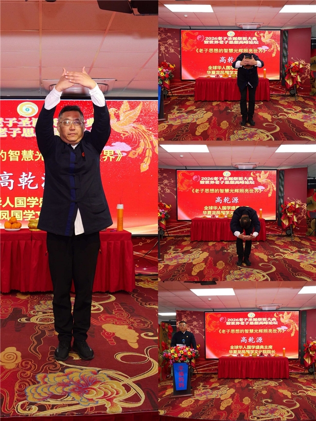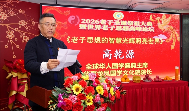 全球华人国学盛典主席、华夏龙凤国学文化院院长高乾源发表《老子思想的智慧光辉照亮世界》主旨演讲,全文如下: